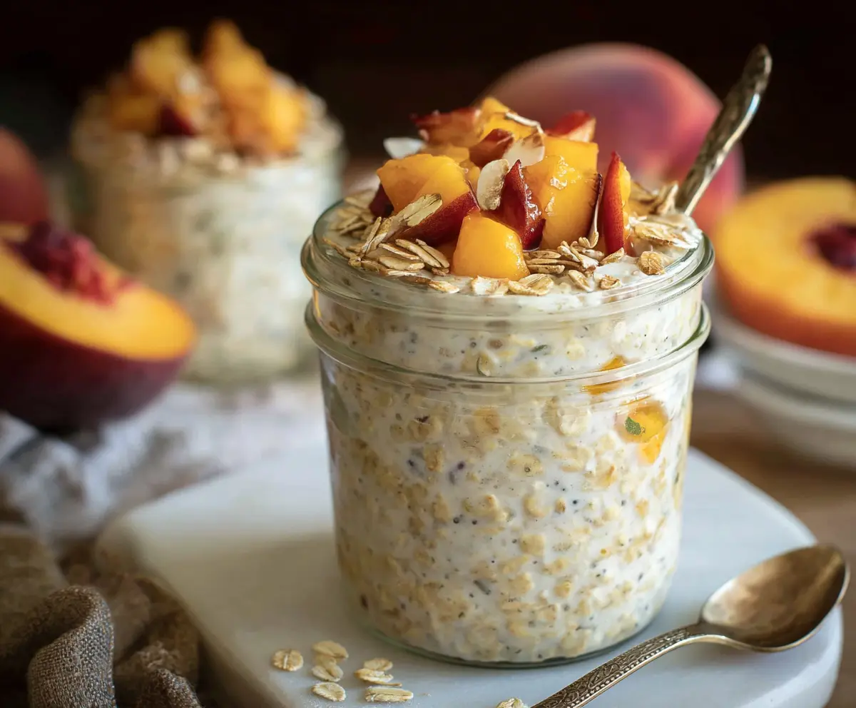 These Peach Cobbler Overnight Oats are a tasty treat to start your day! With creamy oats mixed with juicy peaches and a sprinkle of cinnamon, they remind you of warm cobbler.