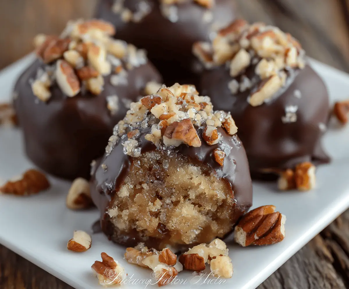 Delicious Pecan Pie Truffles with a rich chocolate coating and crunchy pecan topping