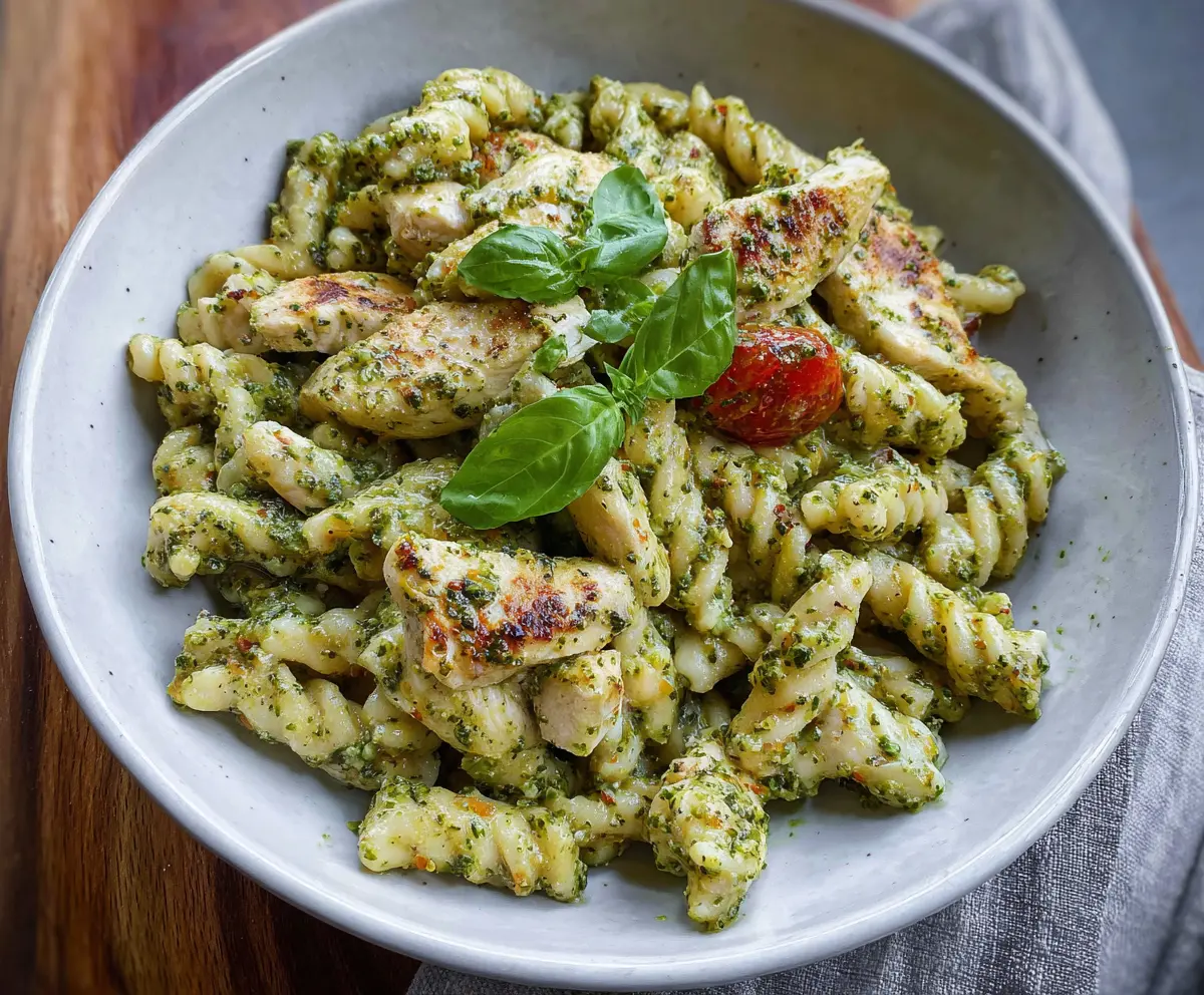 Delicious pesto chicken pasta dish with fresh basil and melted cheese