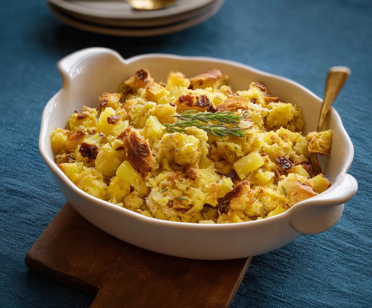 Once baked, let your Pineapple Stuffing cool slightly before serving. This dish is great as a side or even on its own! If you’d like, you can garnish with a bit more chopped rosemary for a fresh touch.