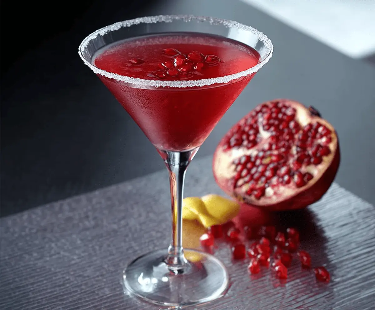 Bright and colorful Pomegranate Martini cocktail garnished with fresh pomegranate seeds and a slice of lime.
