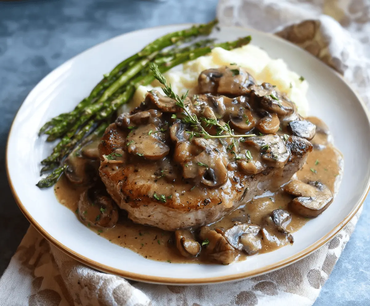 When fully cooked, serve the pork chops topped with the mushroom gravy. Garnish with fresh thyme sprigs if desired. Enjoy it alongside creamy mashed potatoes and your choice of vegetable, like steamed asparagus!