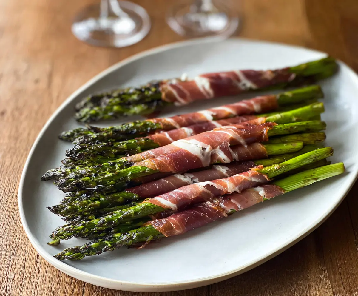 Delicious prosciutto wrapped asparagus spears, grilled to perfection for a savory appetizer.