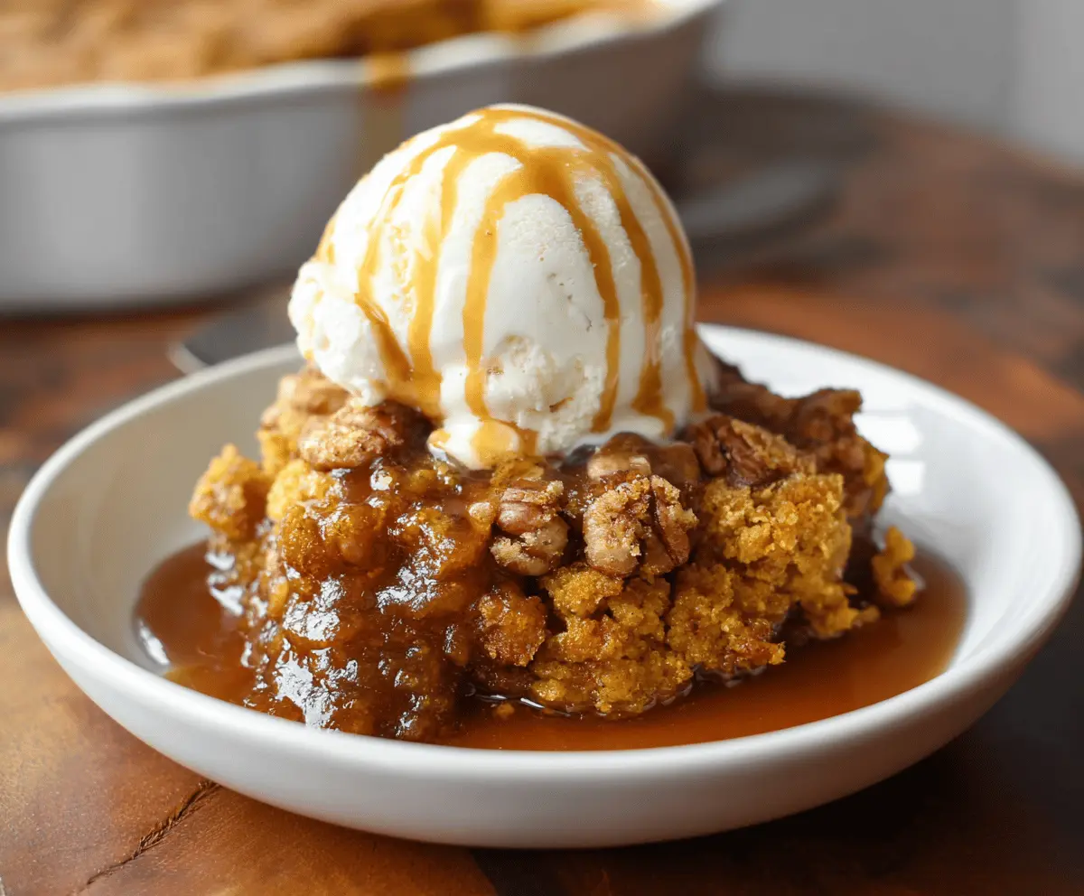 Once out of the oven, let the cobbler cool slightly. Serve it warm with a generous scoop of vanilla ice cream and a drizzle of caramel sauce on top. Enjoy your cozy, warmly spiced pumpkin cobbler!