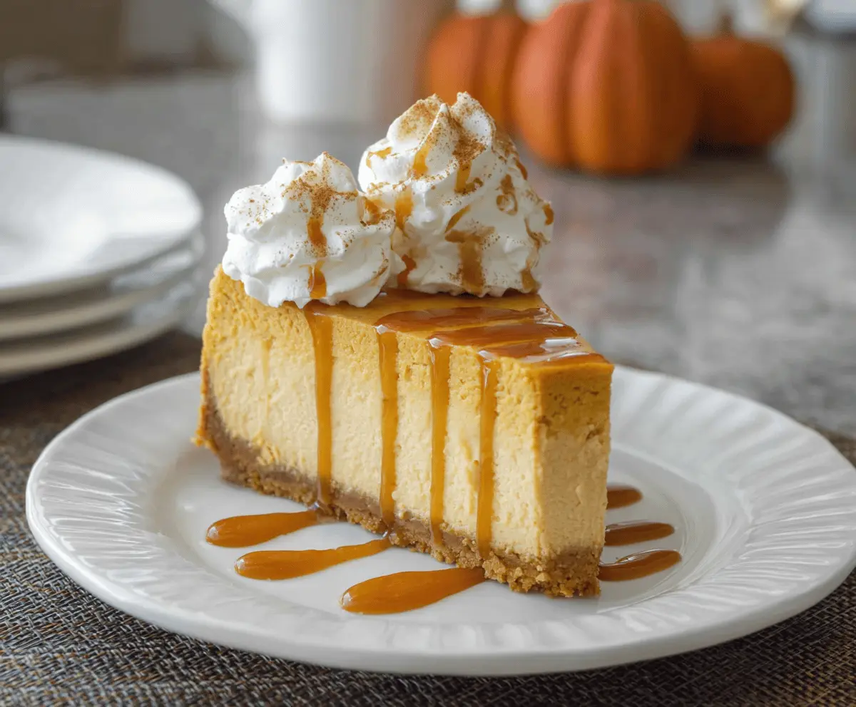 After an hour, carefully remove the cheesecake from the oven and water bath. Chill it in the fridge for at least 4 hours or overnight to let it set fully. When ready to serve, slice the cheesecake and top each slice with whipped cream, a drizzle of caramel sauce (if you like), and a sprinkle of cinnamon or pumpkin pie spice. Enjoy your delicious cheesecake filled with fall flavors!