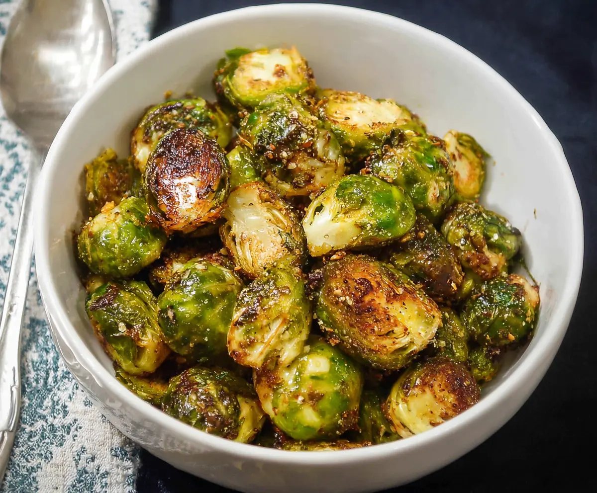Your crispy, flavorful roasted Brussels sprouts are ready to be served! Enjoy them right away as a side dish or snack. Happy eating!
