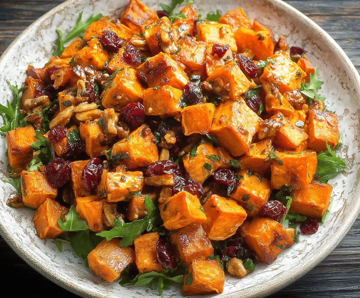 In a large salad bowl, lay a base of fresh arugula or mixed greens. On top of that, add the warm roasted sweet potatoes. Now, sprinkle with dried cranberries, the toasted walnuts, and fresh parsley for a pop of color and flavor.