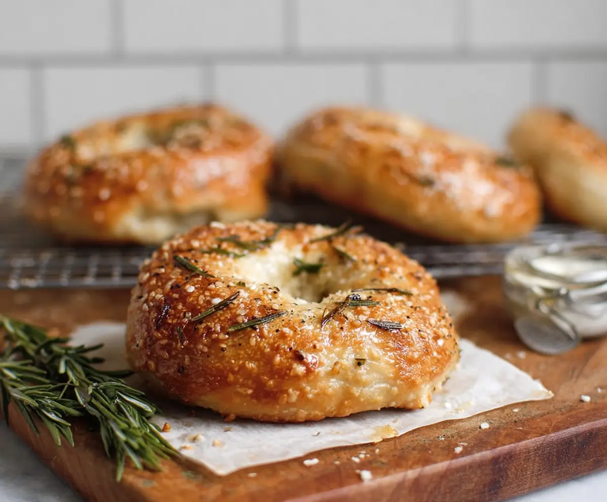 Enjoy your homemade rosemary bagels, with a perfect golden crust and fragrant herb topping!