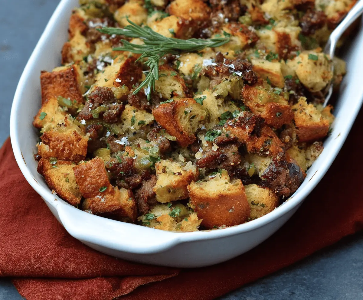 Delicious sausage and herb stuffing with golden crispy top, perfect for holiday dinners.