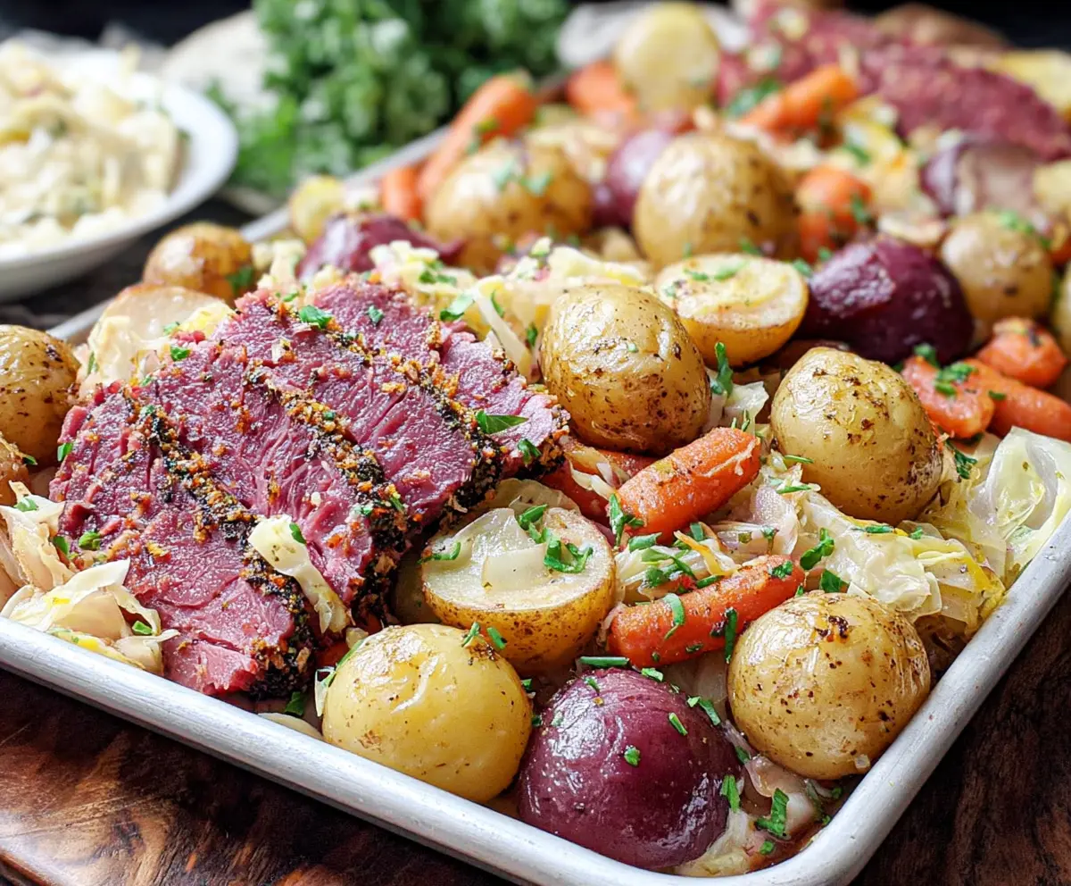 Sprinkle some chopped fresh chives on top for a lovely pop of color and flavor. For those who enjoy a little heat, add a sprinkle of crushed red pepper flakes. Enjoy your hearty, flavorful sheet pan corned beef and cabbage!
