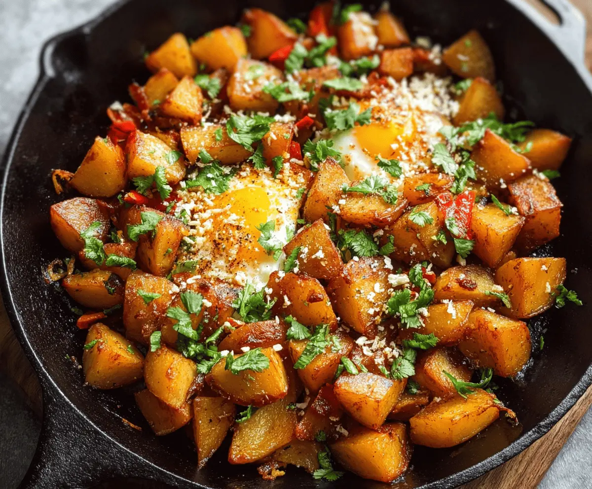 Once the eggs are cooked, remove the skillet from the heat. Sprinkle the dish with chopped parsley and grated Parmesan cheese if you’d like some extra flavor. Serve hot directly from the skillet and enjoy your crispy, flavorful breakfast potatoes with eggs!