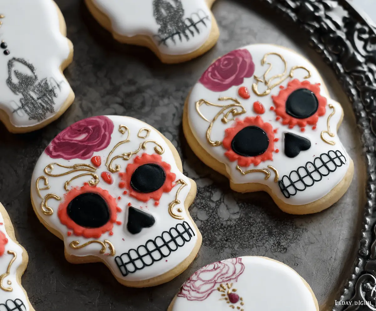 Once your cookies are thoroughly cool, start decorating! Flood the skull cookie base with either white or purple royal icing and let it set to dry slightly, about 15-30 minutes. For the eyes and nose, pipe in blue or teal icing, and create the heart-shaped noses with black icing. Use black icing as well to outline and fill the mouth teeth. Finally, delve into the fun details: add swirls, floral motifs, and more with the complementary colors inspired by traditional sugar skull designs. For extra flair, sprinkle on some edible gold shimmer dust to highlight details and make them sparkle! Allow the decorated cookies to dry completely, preferably overnight, before handling or packaging.
