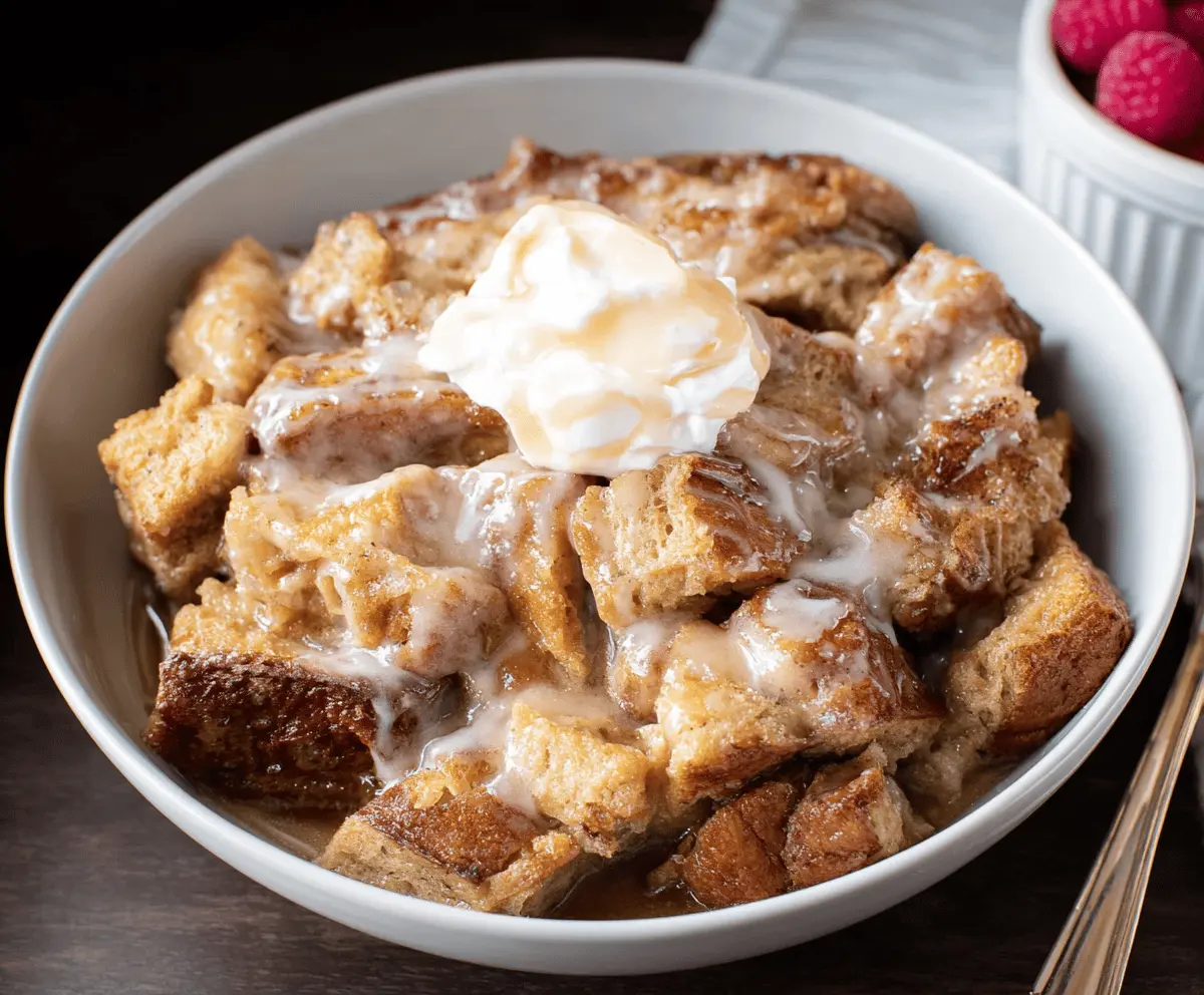When your casserole is ready, carefully remove it from the slow cooker and scoop portions onto plates. Top each serving with maple syrup, a sprinkle of powdered sugar, glaze icing, or fresh banana slices if you like. Enjoy your cozy, comforting treat!