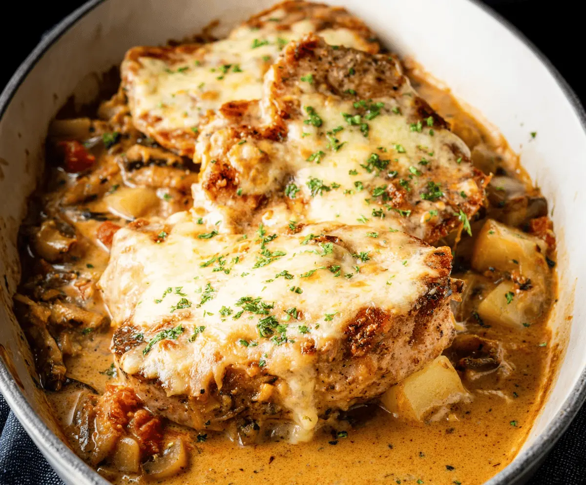 Once baked, remove the casserole from the oven and garnish with fresh chopped parsley for a pop of color. Serve hot, ideally with sides like mashed potatoes, rice, or crusty bread to soak up that amazing sauce. Enjoy your creamy, cheesy Smothered Pork Chop Casserole!