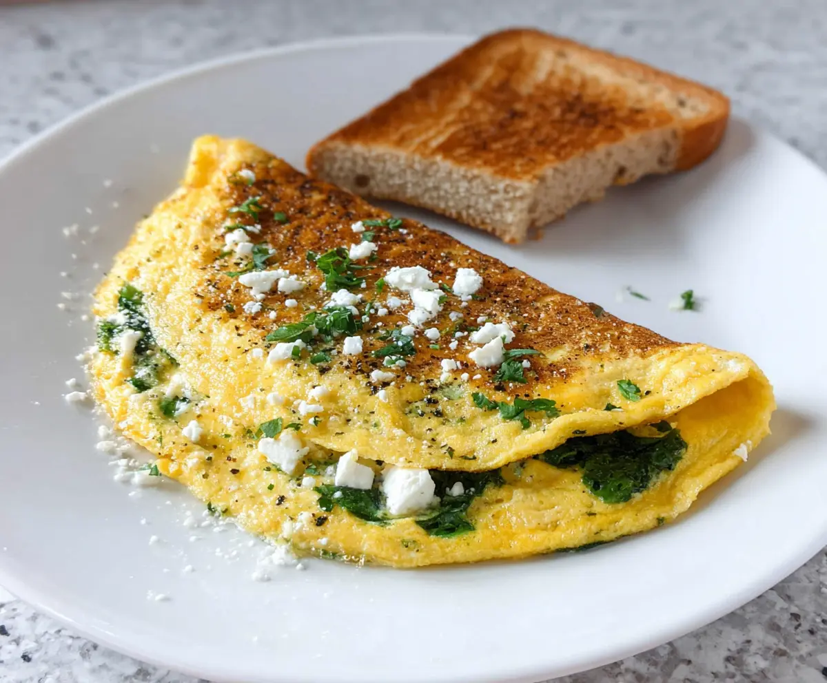 Making this omelet is a breeze! Just whip up some eggs, toss in the spinach and feta, and flip it over. I love enjoying it with a slice of toast—so good!