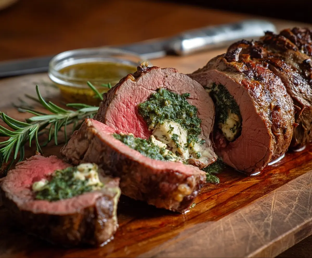 Juicy stuffed beef tenderloin rolled with herbs and vegetables, perfect for a gourmet dinner.