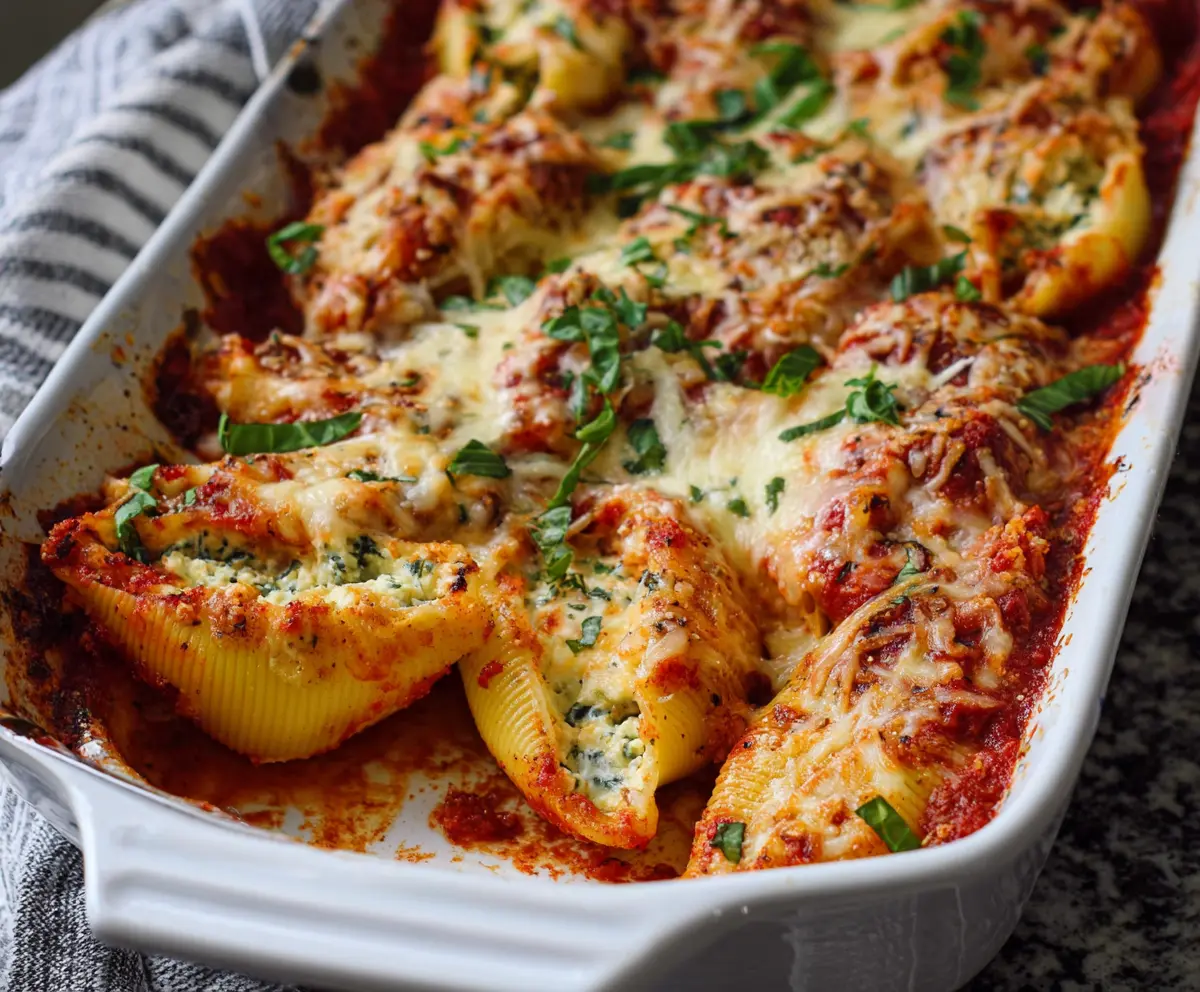 Delicious baked stuffed shells filled with ricotta cheese and marinara sauce, garnished with fresh herbs.