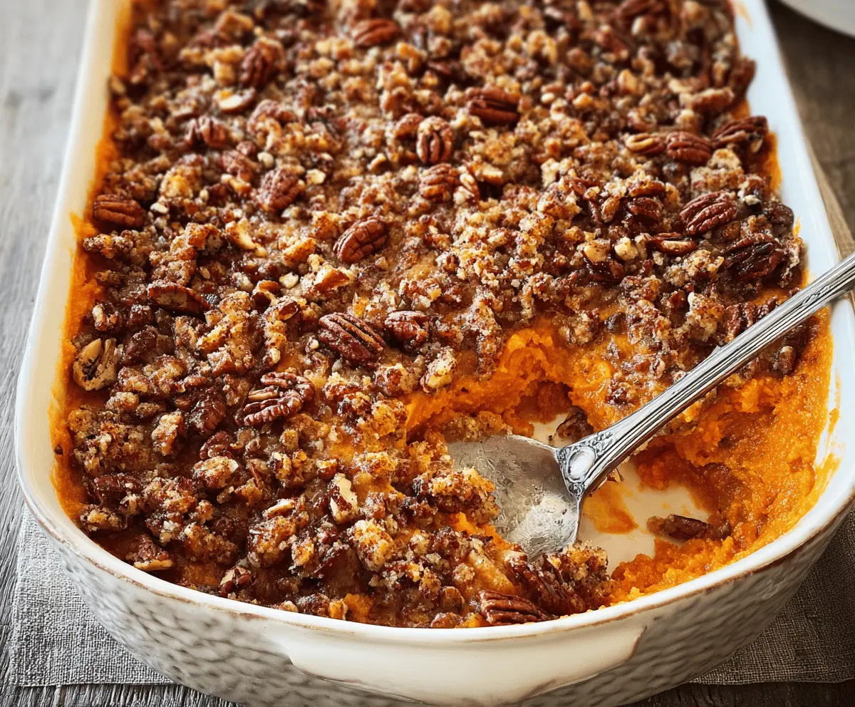 Delicious sweet potato casserole topped with a crunchy pecan streusel for the perfect holiday side dish.