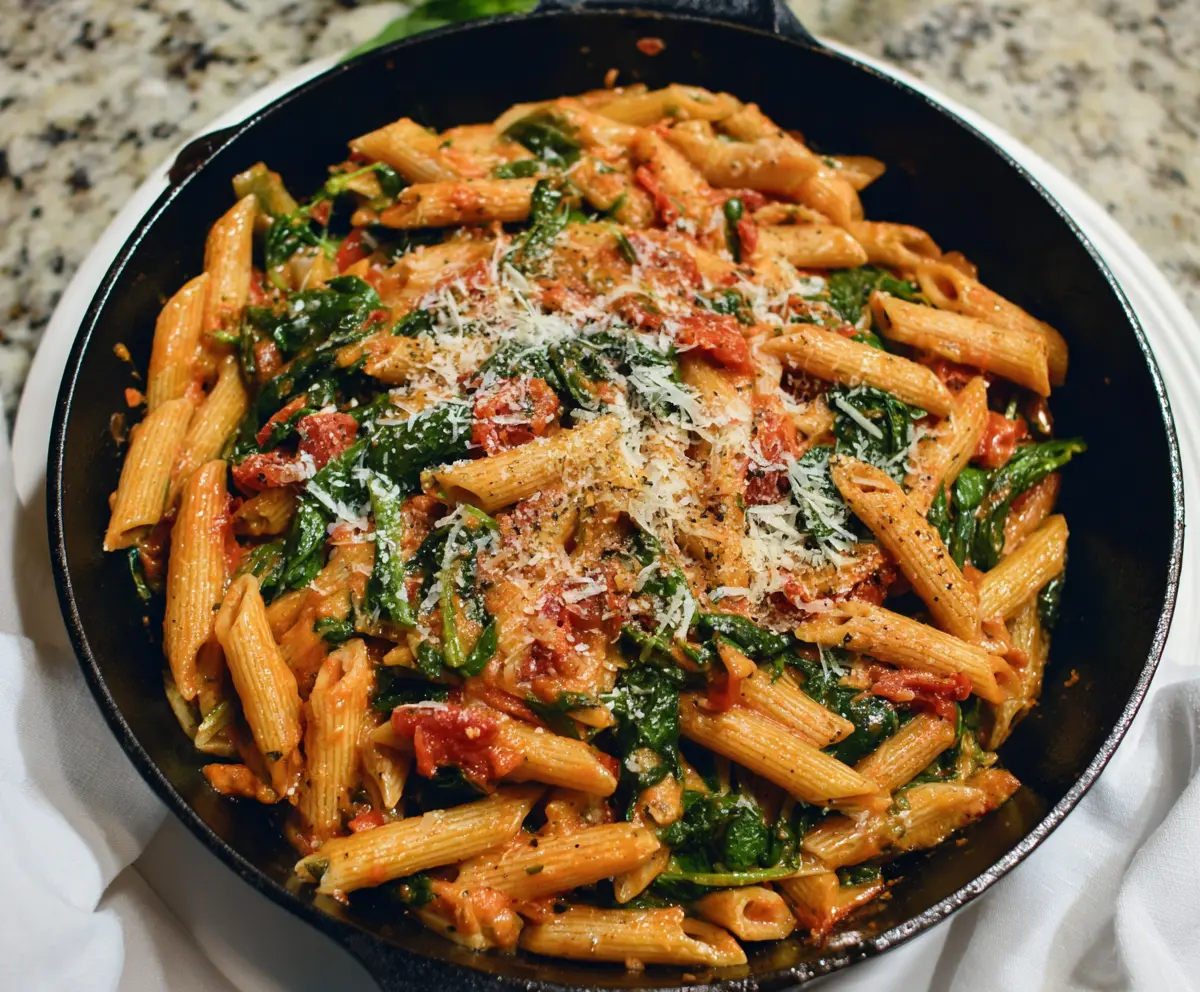 Finally, add the cooked pasta to the skillet with the delicious sauce. Toss everything thoroughly to make sure each piece of pasta is coated with that creamy tomato spinach goodness. Taste it and adjust the seasoning if needed.