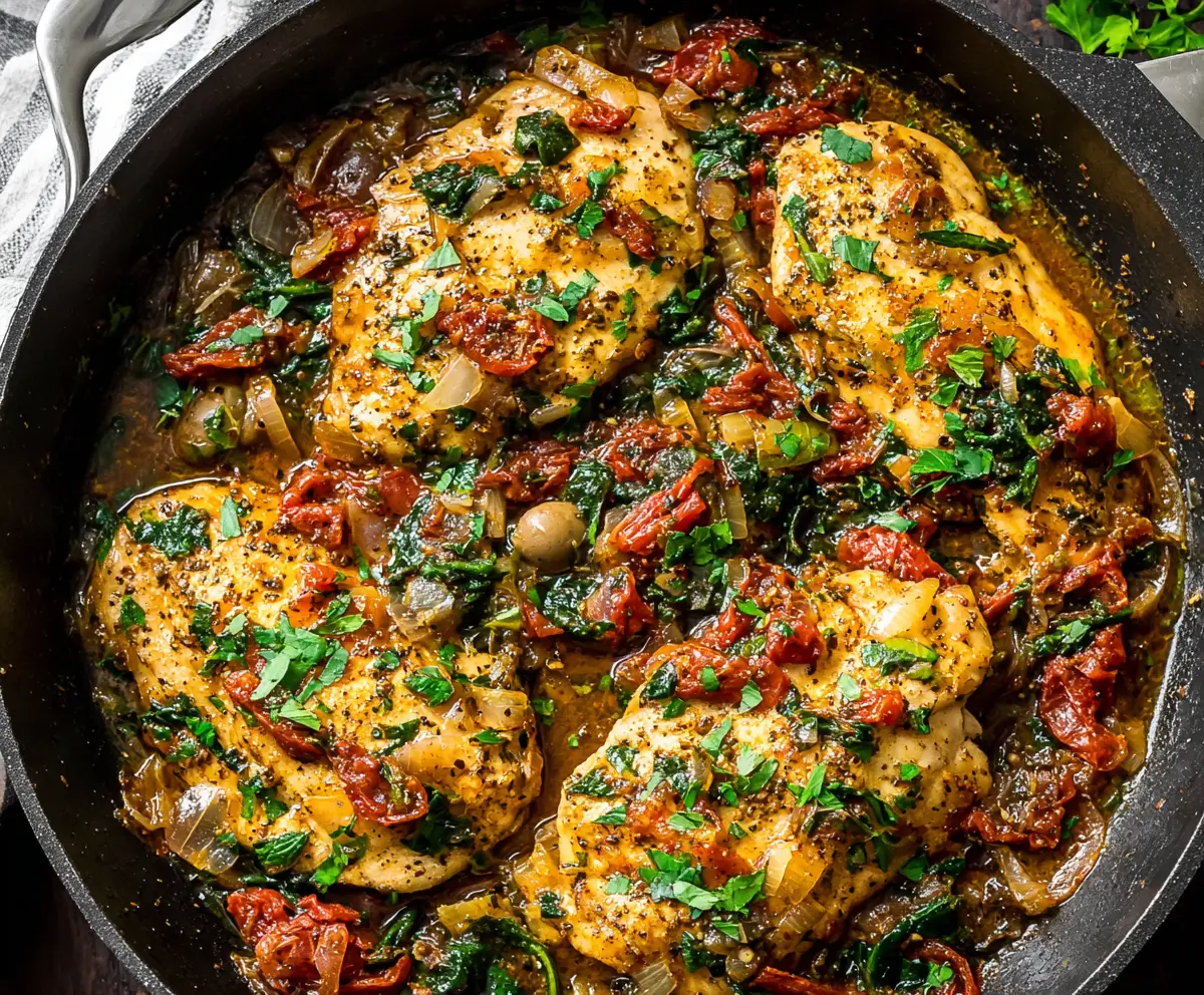 Creamy Tuscan Chicken Skillet with spinach and sun-dried tomatoes served on a rustic plate.
