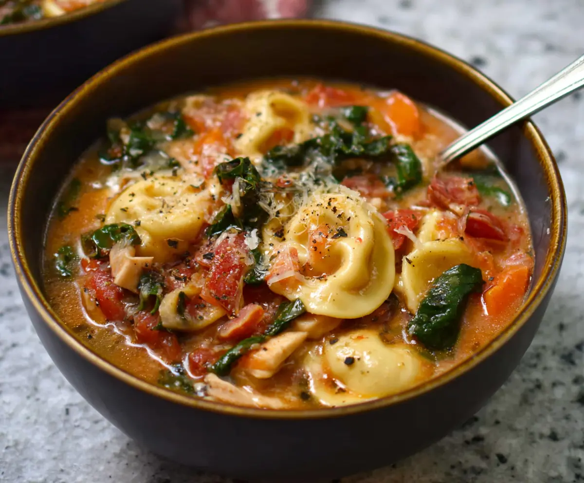 Bon Appétit! Enjoy this comforting Tuscan Ravioli Soup that’s bursting with flavors from tomatoes, spinach, savory chicken, and tender ravioli! Perfect for any day. 😊