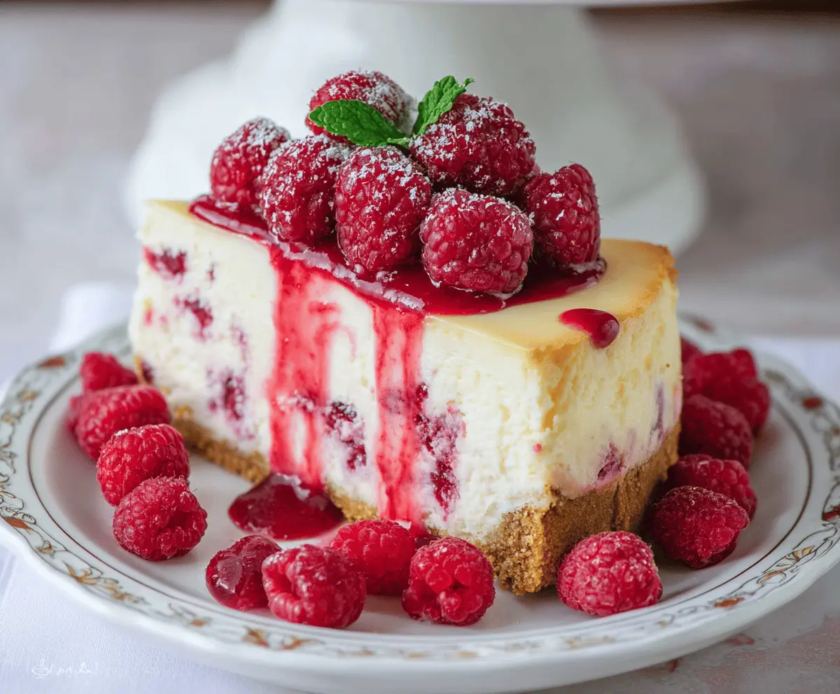 This creamy white chocolate raspberry cheesecake is a treat for your taste buds! With a buttery crust and a swirl of tart raspberries, it’s both sweet and tangy.